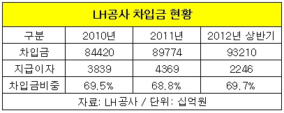 12일 공공기관 경영정보 공개시스템인 알리오에 따르면, LH공사의 지난해 상반기 부채는 133조 6천억 원으로, 2011년 130조 5천억 원에 비해 2% 가량 늘었다. 일부에서는 실제 부채가 138조 1천억 원에 이를 것이라는 분석도 내놓고 있다. 이 경우 부채 증가율은 6%로 높아진다.