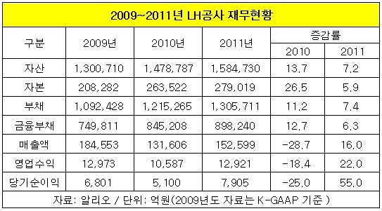 LH공사의 부채액은 지난 2009년 109조 2천억 원에서 2010년에는 121조 5천억 원으로 11.2%나 증가했다. 그리고 2011년에는 130조 5천억 원으로 7.4%가 다시 늘었다.