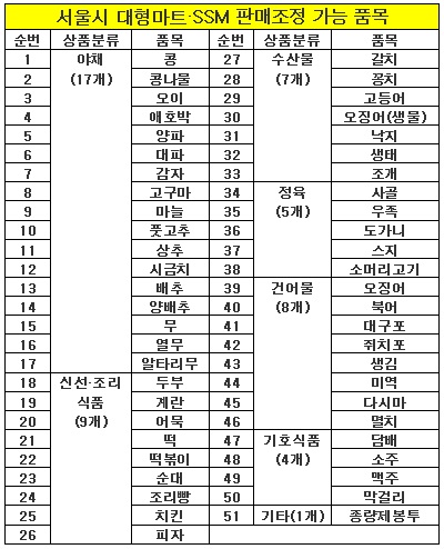 시는 지난해 11월 한국중소기업학회에 용역을 의뢰해 대형마트·SSM 판매조정 가능품목 51종을 선정했다. 51개 품목은 담배 등 기호식품 4종, 배추 등 야채 17종, 계란 등 신선·조리식품 9종, 고등어 등 수산물 7종, 사골 등 정육 5종, 미역 등 건어물 8종, 쓰레기 종량제봉투 등이다.