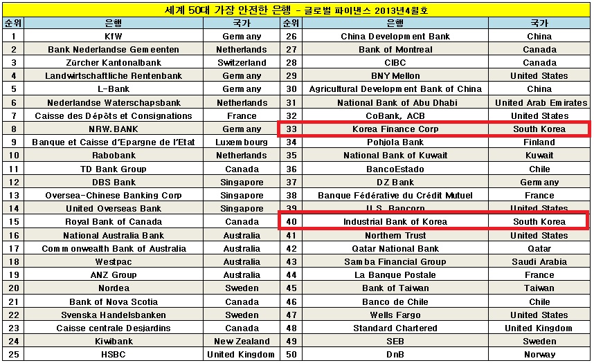 세계에서 가장 안전한 50대 은행에 한국정책금융공사와 산업은행이 선정됐다.