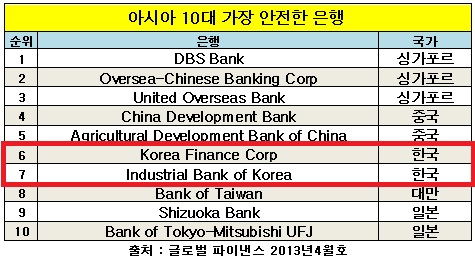 한국정책금융공사와 한국산업은행은 또 아시아에서 가장 안전한 은행 6, 7위에도 선정됐다.