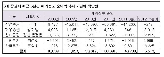 5대 증권사 해외점포의 전체 누적 수지가 2011년 3분기말 487억 원에서 지난해 3분기말 155억 원 흑자로 돌아선 데는 삼성증권의 적자 축소가 큰 몫을 했다.