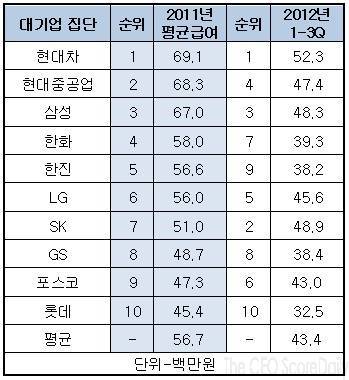 한편 지난해 3분기까지 그룹별 직원 평균 급여는 현대차그룹이 5천230만 원으로 가장 높았다. 2011년 7위였던 SK그룹은 3분기까지 4천890만 원으로 2위에 올랐다. 삼성이 4천830만 원으로 3위를 현대중공업과 LG그룹이 4천740만 원과 4천560만 원으로 4,5위를 기록했다.
