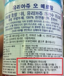 유리아쥬의 '오 떼르말 미스트'는 ‘고온 내지 저온의 장소 및 직사광선이 닿는 곳에는 보관하지 말 것’이라고 두루뭉술한 내용만 기재되어 있었다.