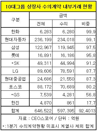 재계 1위인 삼성그룹은 내부거래매출 12조6천199억원 중 97.5%(11조9천945억원)가 수의계약 매출이었다.