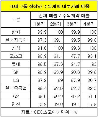 한화는 수의계약 중 내부거래 비중이 4분기 내내 거의 100%에 육박했으며 현대자동차는 1분기 97.3%에서 2분기 99.1%, 3분기 99.5%, 4분기 99.8%로 점점 높아졌다.