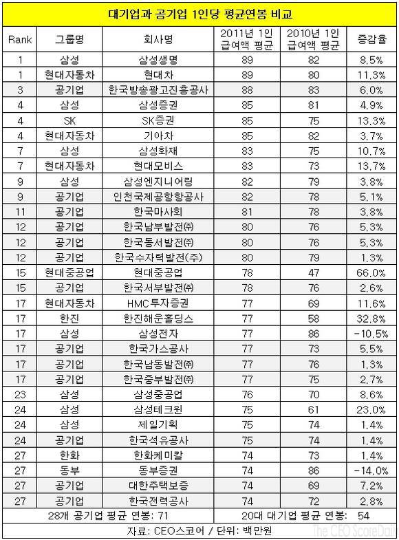 28개 공기업들의 평균 급여 7천130만원은 또 20대그룹의 회사별 평균급여 에서도 선두인 대우조선해양의 7천200만원에 비해 약간 낮았을뿐 2위인 현대차그룹과 같았고 3위인 현대중공업그룹(6천830만원), 4위인 삼성그룹(6천710만원)보다 높았다.