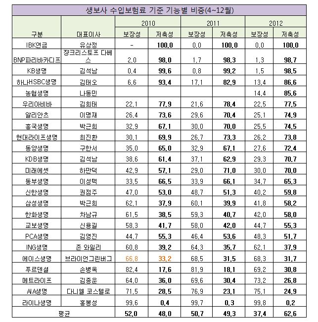 13일 생명보험협회에 따르면 2012회계년도 3분기 누적 기준으로 생명보험사의 저축성보험 수입보험료는 39조3천549억원으로 보장성보험 수입보험료 23조4천793억원 보다 16조원 가량 많은 것으로 집계됐다.