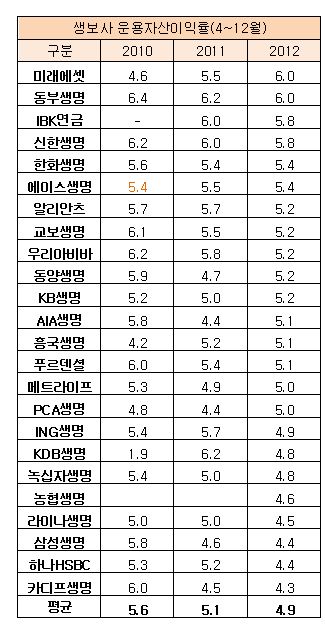 실제로 2012회계연도 3분기 생보사들의 운용자산이익률은 전년동기대비 0.2%포인트 하락한 4.9%를 기록했다. 특히 비엔피파리바카디프생명(4.3%), 삼성생명, 하나HSBC(4.4%), 라이나생명(4.5%) 등의 생보사들은 업계 평균치를 밑돌았다.