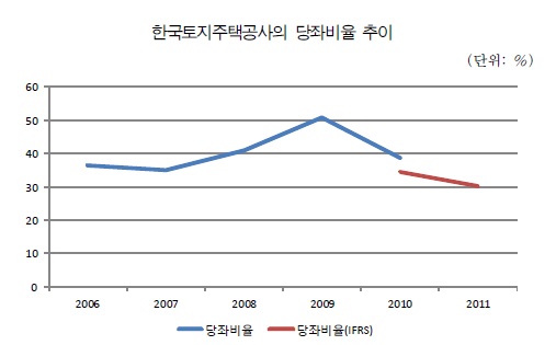 2011년 LH공사의 부채는 전체 공공기관 부채 463조 5천억 원의 28%, 전체 공기업의 부채 329조5천억 원 가운데 40.5%를 차지했다.