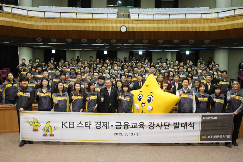 KB금융은 13일 오전 9시 KB국민은행 일산연수원에서 계열사 전·현직 임직원 및 대학생 봉사단으로 구성된 1천여 강사 중 150명의 대표강사가 참석한 가운데 'KB 경제금융교육 강사단 발대식'을 가졌다. 이날 발대식에는 어윤대 KB금융지주 회장, 김왕기 부사장, 심원경 KB금융공익재단 사무국장을 비롯한 계열사 임직원들이 참석했다.