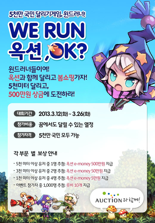 위메이드 엔터테인먼트(대표 김남철, 남궁훈)의 러닝 어드벤처 모바일 게임 '윈드러너:진화의 시작 for kakao'(이하 윈드러너)가 온라인 마켓플레이스 옥션과 함께 손을 잡고 'WE RUN 옥션, OK?' 달리기 대회를 시작했다.