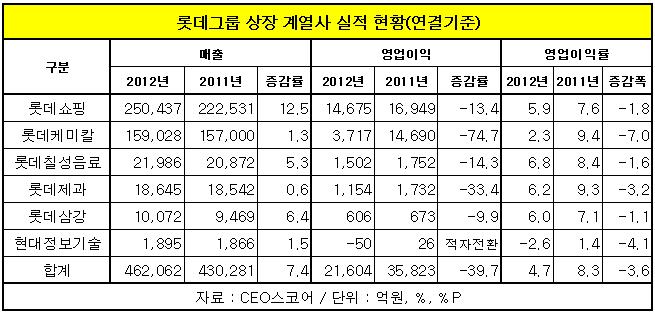 롯데쇼핑은 지난해 매출(25조437억원)은 12.5% 증가해 상장계열사중 유일하게 두자릿수 성장을 했지만 영업이익(1조4천675억원)은 같은 기간 13.4% 감소했다. 롯데칠성음료도 같은 기간 매출(2조1천986억원)은 5.3% 증가했지만 영업이익(1천502억원) 14.3%나 감소했다.