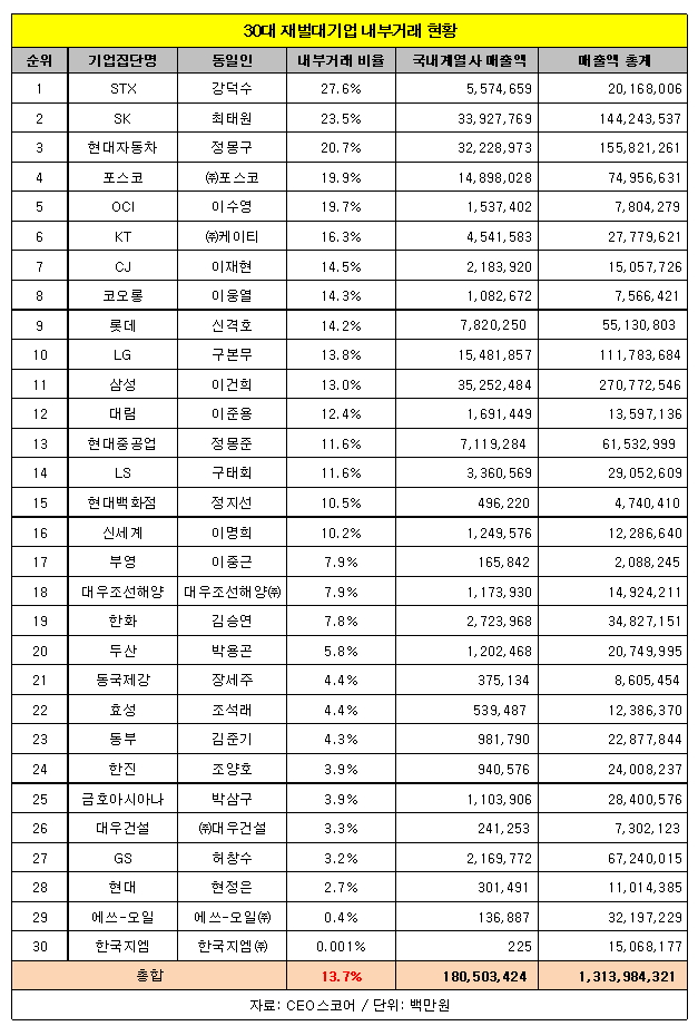 15일 재벌 및 CEO, 기업경영성과 평가사이트인 CEO스코어(대표 박주근)에 따르면 2011년 국내 30대 그룹 상장사들의 내부거래 규모는 180조5천억 원에 달했다. 이들 기업의 총 매출 1천313조9천억 원과 비교하면 13.7%에 이르는 규모다.