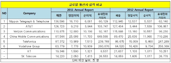 매출은 SKT보다 많은 216억 달러를 기록했지만 보다폰에 비해 3분의 1 정도에 그친다. 영업이익도 NTT를 제외하면 수십 배의 차이를 보인다.