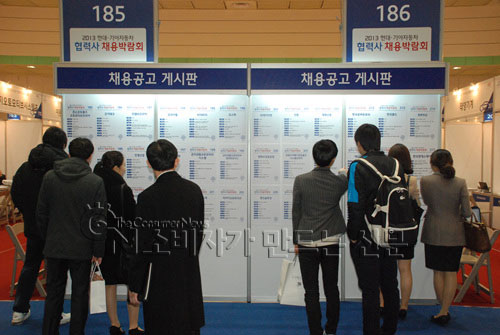 현대기아차는 14일 강남구 삼성동 코엑스에서 지난해 동반성장 성과와 올해 계획을 알리는 '협력사 동반성장 설명회'와 중소 협력사의 인재 확보를 지원하는 '2013 현대·기아차 협력사 채용박람회' 개막식을 열고 1만 명의 신규 일자리를 창출 계획을 밝혔다.