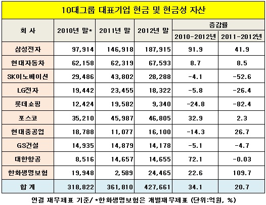 지난해만 따질 경우 10대 그룹 대표기업의 현금성 자산은 42조7천661억 원으로 2011년 말 36조1천810억 원 보다 20.7% 늘어났다.