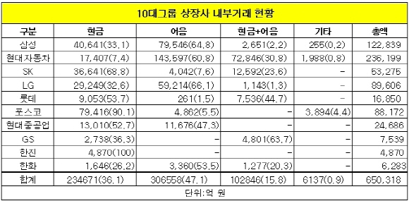 15일 재벌 및 CEO, 기업 경영성과 평가 사이트인 CEO스코어(대표 박주근)에 따르면 지난해 10대그룹 상장 계열사 간 내부거래에서 이뤄진 현금결제는 23조4천671억 원으로 전체 거래금액의 36.1%를 차지했다.