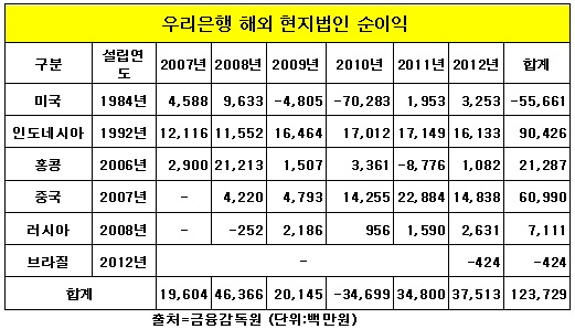 우리은행의 해외사업은 글로벌 금융위기가 시작된 지난 2008년 463억6천600만 원의 순이익을 기록했으나 다음에 순이익이 201억4천500 만원으로 반토막 난 뒤 2010년에는 346억9천900만 원의 순손실을 내며 극심한 경영난에 시달렸다.
