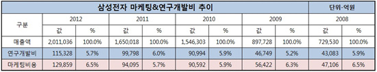 삼성전자의 마케팅 비용의 상승은 지난 2010년 R&D 투자에 더 많은 자금을 쏟아 붓기 시작한 지 2년 만의 일이다.
