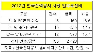 19일 한국전력공사에 따르면 김중겸 전 사장은 지난해 총 85건에 대한 업무추진비로 2천420만 원을 지출했지만 이 가운데 단 3건만 증빙서류를 갖춰 구체적인 사용내역을 밝혔다.