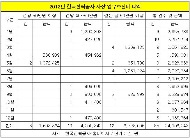 한국전력공사 관계자는 "한전은 철저하고 투명하게 업무추진비를 운영하고 있어 문제가 될 소지가 있는 내역이 없다"며 "절차상 문제로 지금 당장은 구체적 내역에 대해 공개할 수는 없다"고 설명했다.