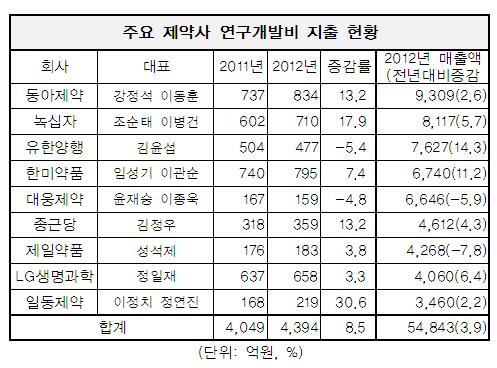 지난해 359억 원의 연구개발비를 지출한 종근당 역시 매출 증가율은 4.3%에 그쳤다.