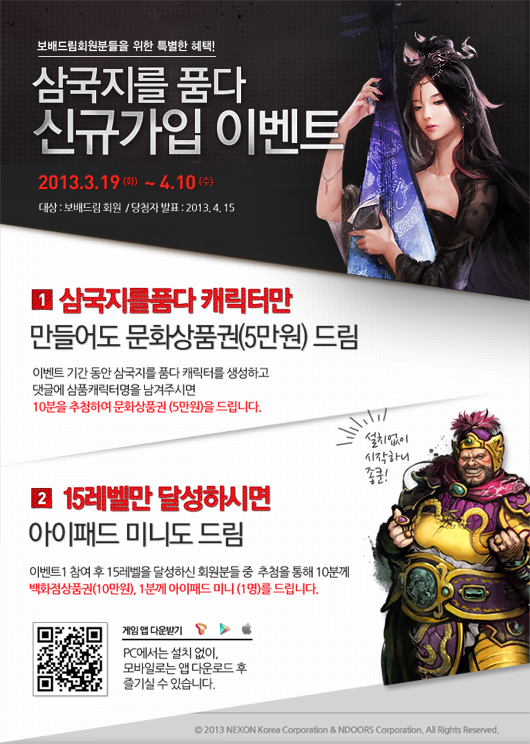 넥슨(대표 서민)은 19일 자사가 서비스하고 엔도어즈(대표 조성원)가 개발한 멀티플랫폼 3D MMORPG '삼국지를 품다'에서 오는 4월 10일까지 신규 회원을 대상으로 다양한 프로모션을 진행한다고 밝혔다.