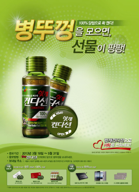 CJ제일제당이 ‘헛개컨디션 100% 당첨 병뚜껑 이벤트’를 5월 31일까지 진행한다.