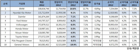 현대기아차는 12조9천억 원의 순이익을 내 순이익률 9.8%로 11.4%의 폭스바겐 다음으로 높았다. 영업이익률에서 1위인 BMW는 순이익률은 6.7%에 머물렀다.