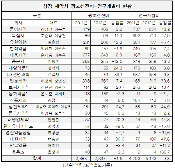 광고선전비를 가장 크게 줄인 곳은 제일약품(대표 성석제)으로 2011년 73억 원에서 지난해 55억 원으로 24.3%나 감소했다. 같은 기간 연구개발비 지출은 183억 원으로 3.8% 늘었다.