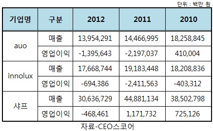 이노눅스와 AUO는 지난해 2011년 대비 손실 폭을 줄이긴 했지만 여전히 7천억 원과 1조4천억 원의 영업적자를 냈다. 샤프는 2011년 1조2천억 원 가량의 이익을 냈으나 지난해에는 4천700억 원의 손실을 내며 적자전환했다.