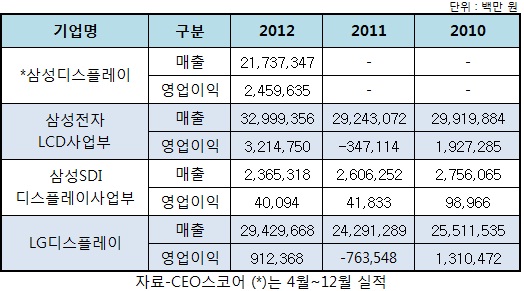 삼성디스플레이의 지난해 실적을 재작년 실적과 비교할 수는 없지만 삼성전자 LCD사업부가 2011년 3천500억 원 영업적자에서 지난해 3조2천억 원 흑자로 돌아선 것에 비춰보면 큰 폭의 실적개선이 있었음을 유추할 수 있다.