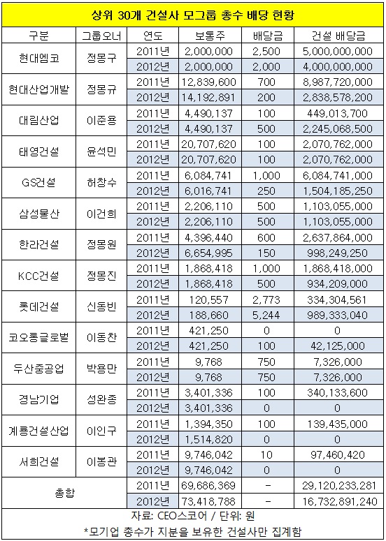 심지어 총수들이 보유한 총 주식수가 늘어났음에도 불구하고 배당금 총액은 크게 감소해 최악의 건설경기를 실감케 했다.