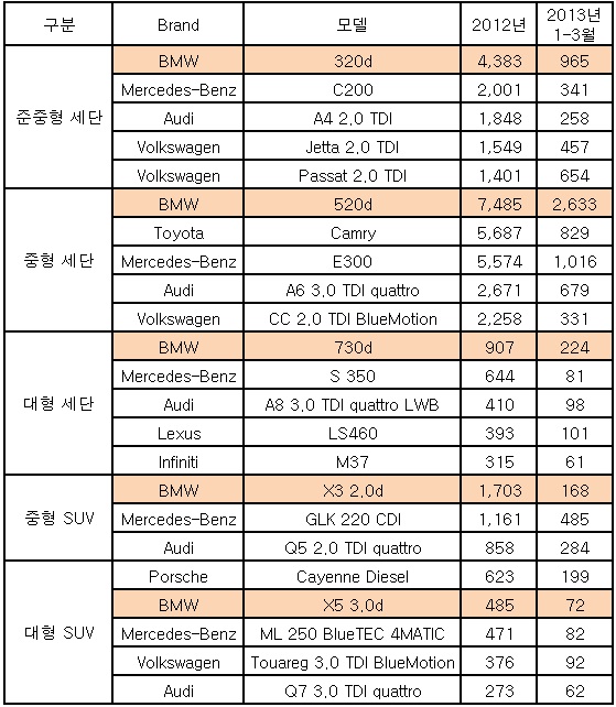 대형 SUV에서도 BMW X5 3.0d는 지난해 485대로 포르쉐 카이엔(623대)에 이은 2위를 차지했다.