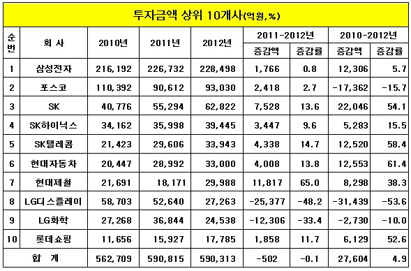 2011년 투자액이 82조1천157억 원으로 2010년 74조6천814억 원 보다 10% 늘었던 것에 비하면 지난해 경기침체로 대기업들이 긴축투자에 나섰음을 보여준다.