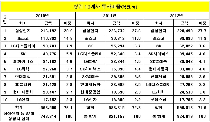 증가율은 한 자릿수에 그쳤지만 10대 그룹 상장사 83개의 총 투자비용 중 27%를 혼자 차지할 정도로 비중이 높았다.