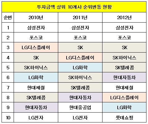 최근 업황침체 등으로 실적부진을 겪고 있는 LG디스플레이는 2년 전에 비해 지난해 투자금액이 53.6% 줄었고 포스코(-15.7%), LG화학(-10%)도 두자릿수 감소율을 기록했다. LG그룹 간판계열사인 LG전자는 투자금액 10위 안에 이름을 올리지도 못했다.