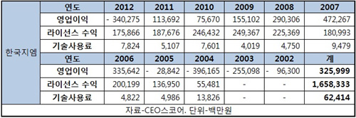 12일 재벌 및 CEO 경영 평가사이트인 CEO스코어(대표 박주근)에 따르면 한국지엠은 지난 2004년 과거 대우자동차 해외제조법인들로부터 555억 원의 기술사용료를 받은 것을 시작으로 매년 1천억~2천억 원대의 지적재산권 수입을 거뒀다.
