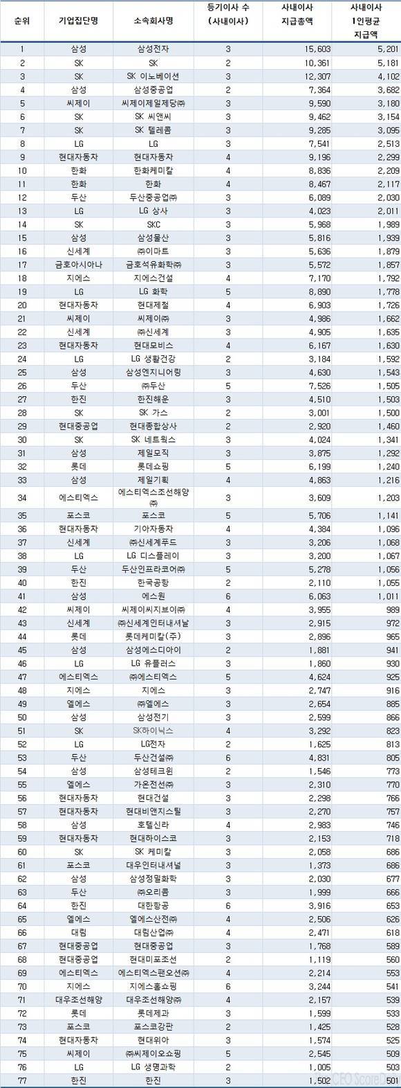 국내 20대 재벌그룹 비금융상장사 136개사 중 절반이 훨씬 넘는 77개사(57%)의 등기임원 평균 연봉이 5억원을 넘었다. 이들 그룹총수와 오너 가족들이 계열사의 등기임원으로 등록돼 있는 것으로 나타났다.