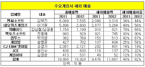 29일 재벌 및 CEO, 기업 경영성과 평가 사이트인 CEO스코어(대표 박주근)에 따르면 엔씨소프트(대표 김택진)와 네오위즈게임즈(대표 이기원)를 비롯한 10대 게임사(NHN한게임은 해외매출 비중을 따로 표기하지 않아 제외)의 지난해 해외매출은 총 1조1천667억 원으로 전체 매출 1조8천928억 원 가운데 62%를 차지했다.