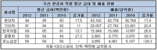 쌍용차의 직원 급여 및 매출 증가율은 국내 5개 완성차 업체 가운데 가장 높았다.