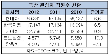 한편 직원수는 현대차가 5만6천137명에서 5만9천831명(6.6%. 3천694명)으로 가장 많이 늘었다. 이어 한국지엠이 1만6천94명에서 1만7천147명으로 6.5%(1천53명), 기아차가 3만2천599명에서 3만2천756명으로 0.9%(157명) 증가했다.