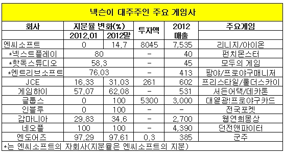 여기에 국내 2위 게임업체인 엔씨소프트와 매출순위 9위 JCE, 10위 게임하이가 모두 넥슨이 최대 주주로 있는 게임사다.