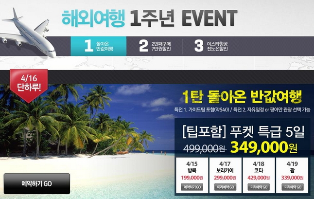 이와 함께 ‘이스타항공’ 취항 전 노선을 최대 4만원까지 할인해 주는 할인쿠폰도 증정한다. 쿠폰 사용시 도쿄는 13만3천원에, 오사카는 5만9천원에, 방콕은 14만8천원에 구입 가능하다(유류비, 세금 제외). 옥션 해외여행 재이용 고객을 위한 이벤트도 구성됐다. 올 3월까지 옥션 해외여행상품 구입 경험이 있는 고객들은 이벤트 페이지에서 응모하면 추첨을 통해 매일 100명에게 7만원 할인쿠폰이 제공된다. 발급 이후 7일간 100만원 이상 해외여행 상품 구입시 사용할 수 있다.