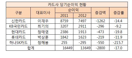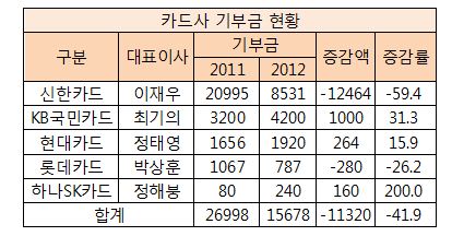 기부금을 늘린 곳이 더 많지만 2011년 209억9천500만 원을 기부해 전체 금액의 77.8%를 차지했던 신한카드(사장 이재우)가 지난해 기부금을 124억6천400만 원이나 삭감해 큰 영향을 끼쳤다.
