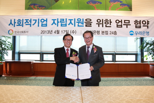 [소비자가만드는신문=윤주애 기자] 우리은행(은행장 이순우)은 17일 중구 회현동 본점에서 이순우 은행장과 이종수 재단법인 한국사회투자 이사장이 참석한 가운데 사회적기업 자립지원을 위한 업무협약을 체결했다.