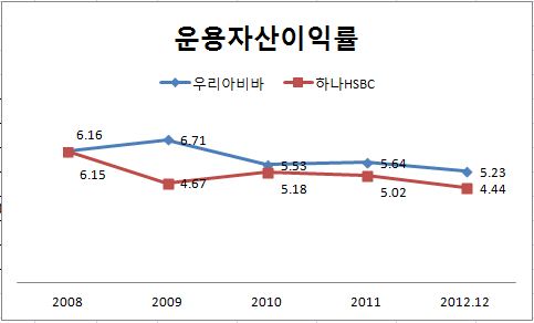 하나HSBC는 운용자산이익률이 2008년 6.15%에서 2009년 4.57%로 떨어졌다가 이내 5%를 회복했으나 지난해 12월말 4.44%로 하락했다.