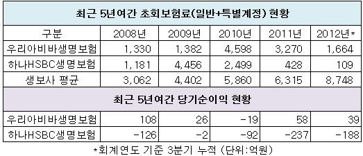2008년 우리아비바생명의 초회보험료는 1천330억 원으로 24개 생보사 평균치인 3천억 원의 절반에도 미치지 못했다. 하나HSBC생명도 사정은 마찬가지였다.