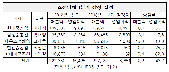 현대중공업과 삼성중공업, 대우조선해양, 한진중공업, 현대미포조선 모두 영업이익이 두자릿수 감소율을 기록했으며 매출은 대우조선해양과 삼성중공업만 늘었다.